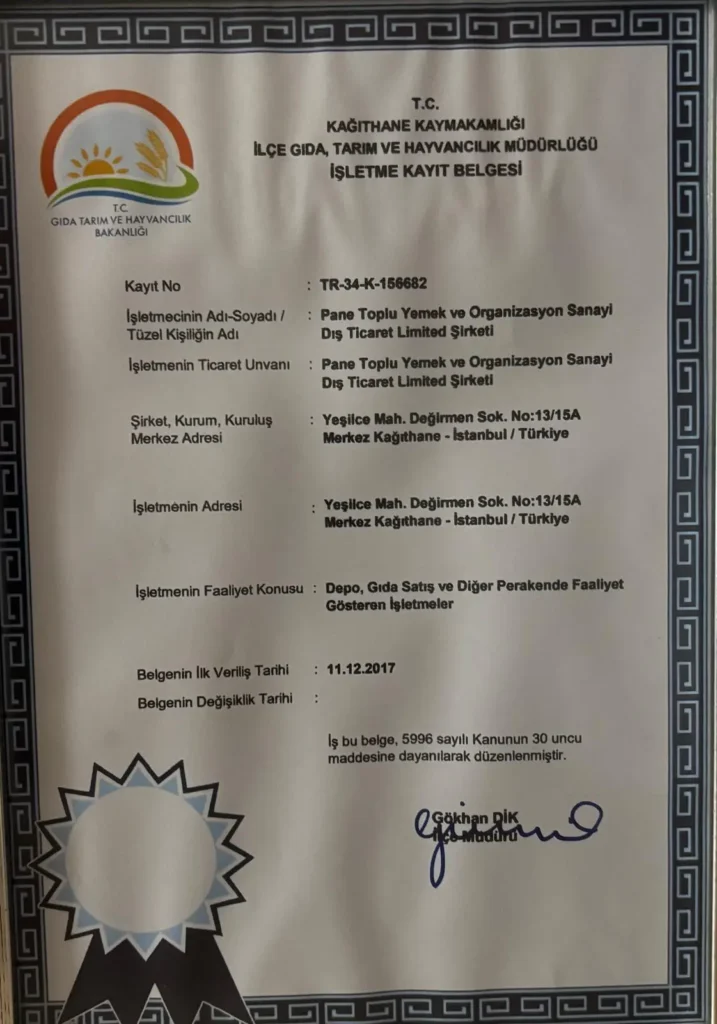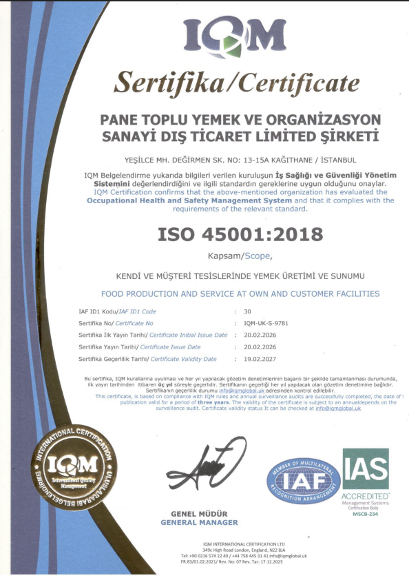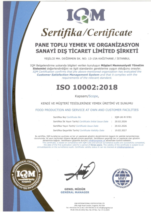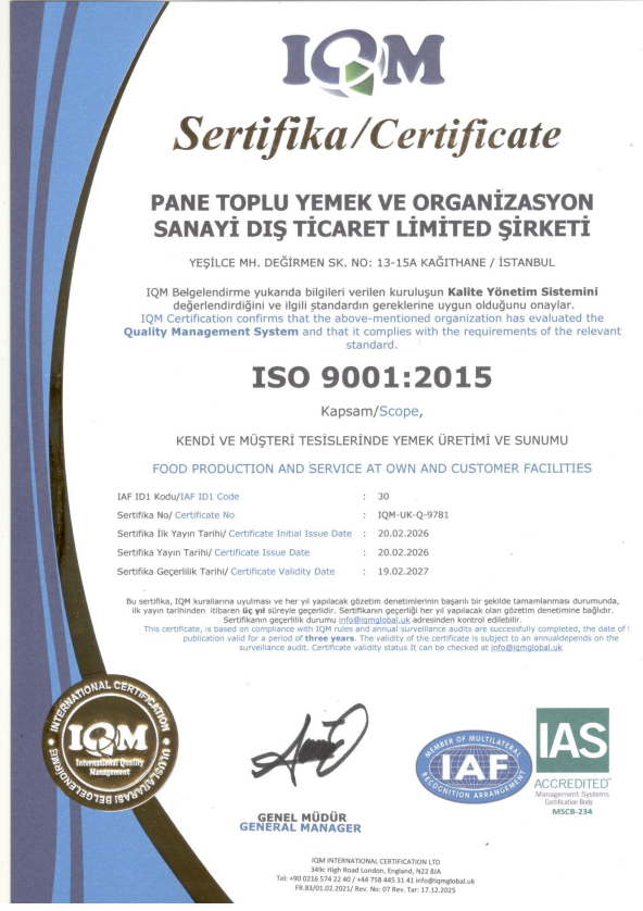 Hizmet kalitemizi ulusal ve uluslararası standartlarla güvence altına almak amacıyla Kalite Yönetim Sistemi, Gıda Güvenliği Yönetim Sistemi ve Çevre Yönetim Sistemi başta olmak üzere gerekli tüm kalite belgelerine sahibiz.Aşağıda, hizmet anlayışımızı ve üretim standartlarımızı belgeleyen sertifikalarımızı inceleyebilirsiniz.